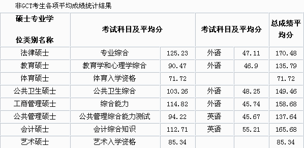 二、非GCT成績在各學位類別相關考試科目中,法律碩士專業(yè)綜合滿分為300分;教育碩士教育學和心理學綜合、公共衛(wèi)生碩士公共衛(wèi)生綜合、工商管理碩士綜合能力、會計碩士綜合知識、公共管理碩士公共管理綜合能力測試滿分為200分;體育碩士入學資格和藝術碩士入學資格滿分為150分;其它考試科目滿分均為100分。